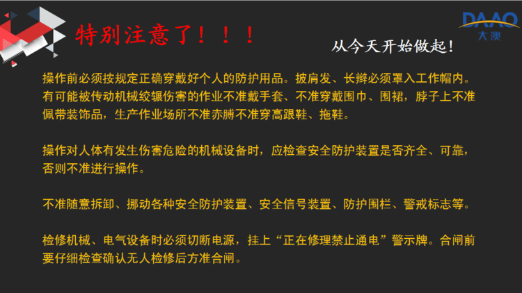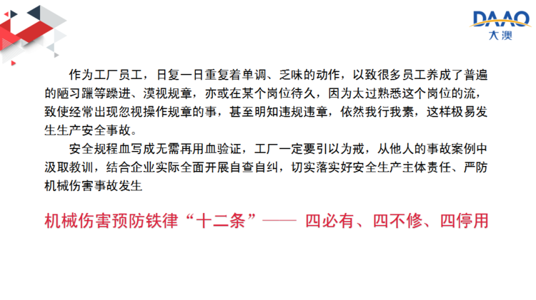 通过培训对机械操作要领和安全常识也有了更深的认识。对机械伤害预防铁律“十二条”—— (四必有、四不修、四停用)加深了认识。
