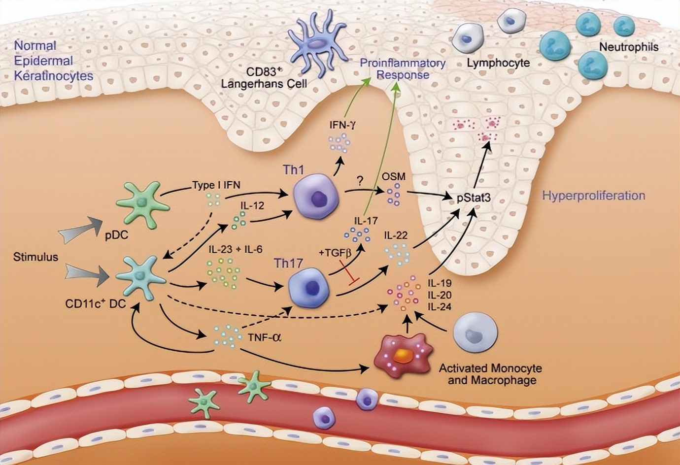银屑病顽固性与免疫紊乱相关,炎症性细胞因子作为主要介质,在过度活化多种免疫细胞及角质形成细胞相互作用下,形成细胞因子网络恶性循环。