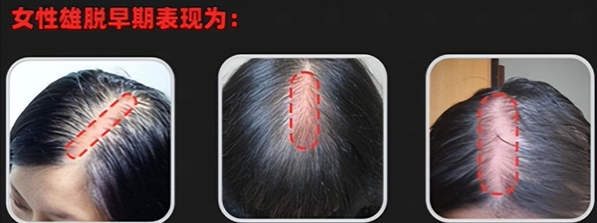 女性雄脱的主要表现为,头顶部和发缝之间变宽,出现头发弥漫性稀疏,但是发际线位置并不发生改变。